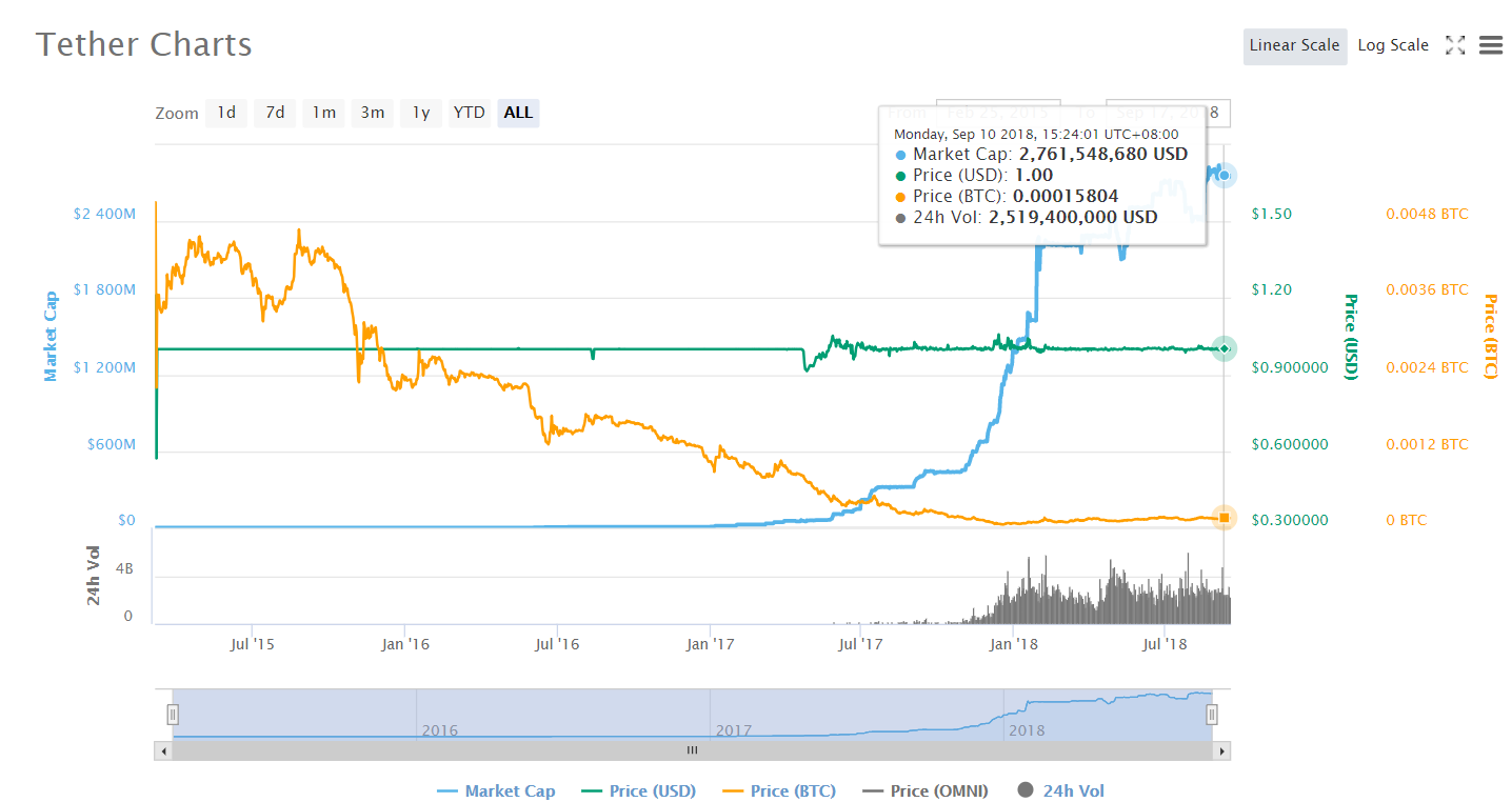 从上图CoinMarketCap上我们可以看到,17年4月USDT流通量大概5000万美元,到17年底高达近14亿美元,到今天已经有27亿美元了。