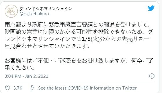 1月14日,因新冠肺炎疫情在日本有扩散趋势,为了避免疫情感染进一步扩大,日本制片方在经过了慎重的讨论后决定,《新世纪福音战士剧场版:终》将再一次延期上映。